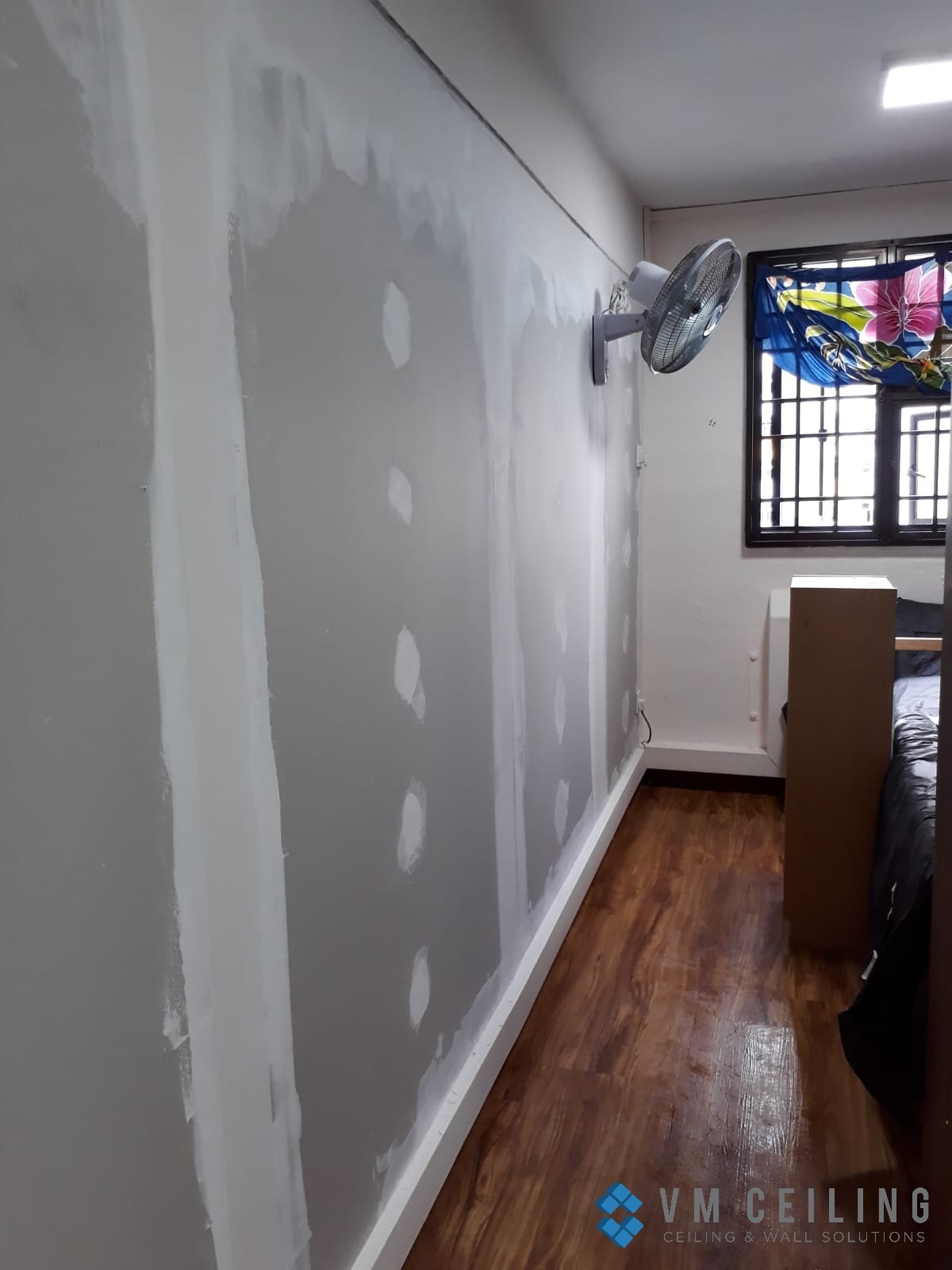 VM False Ceiling Singapore Partition Wall Contractor did a partition wall installation in an HDB flat in Macpherson, Singapore. The client had a Rockwool Internal Partition Insulation installed to soundproof their walls and to reduce the noise coming from their neighbour. We also helped relocate their existing power points and wall fan to the new partition wall.