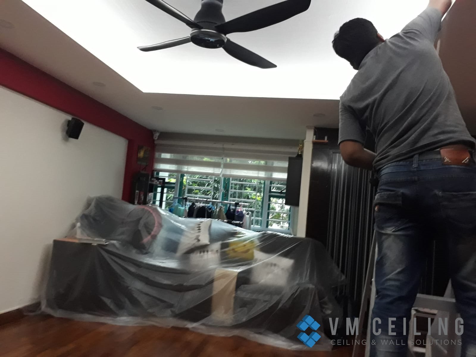 VM False Ceiling Singapore Partition Wall Contractor did a partition wall and cove lighting installation in an HDB flat in Admiralty, Singapore. This client wanted to revamp his living room’s existing plain ceiling, hence he opted to install a new one. Along with a new ceiling fan, we also installed new cove lighting on the false ceiling and relocated their downlights.